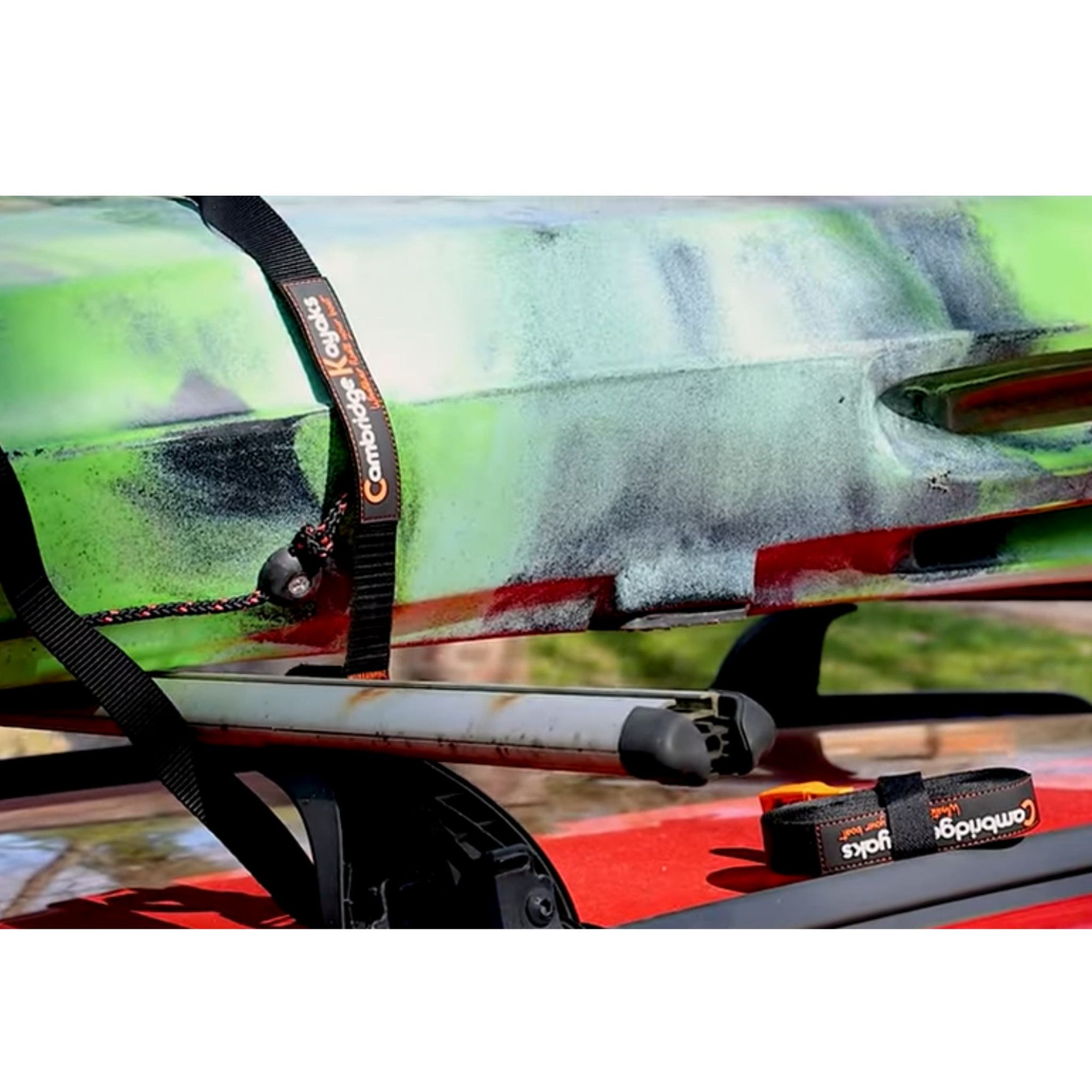 Front view of the Cambridge Kayaks 4-metre tie-down straps, showing the sturdy buckle, logo branding, and durable webbing designed for securing kayaks during transport.